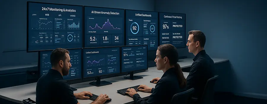 - 24×7 monitoring and real-time analytics with AI-driven anomaly detection across all attack surfaces.