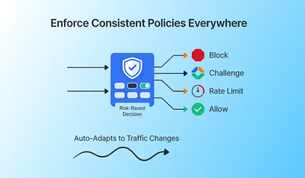 - Apply the right response in real time—block, challenge, rate-limit, or allow—based on risk and business impact.